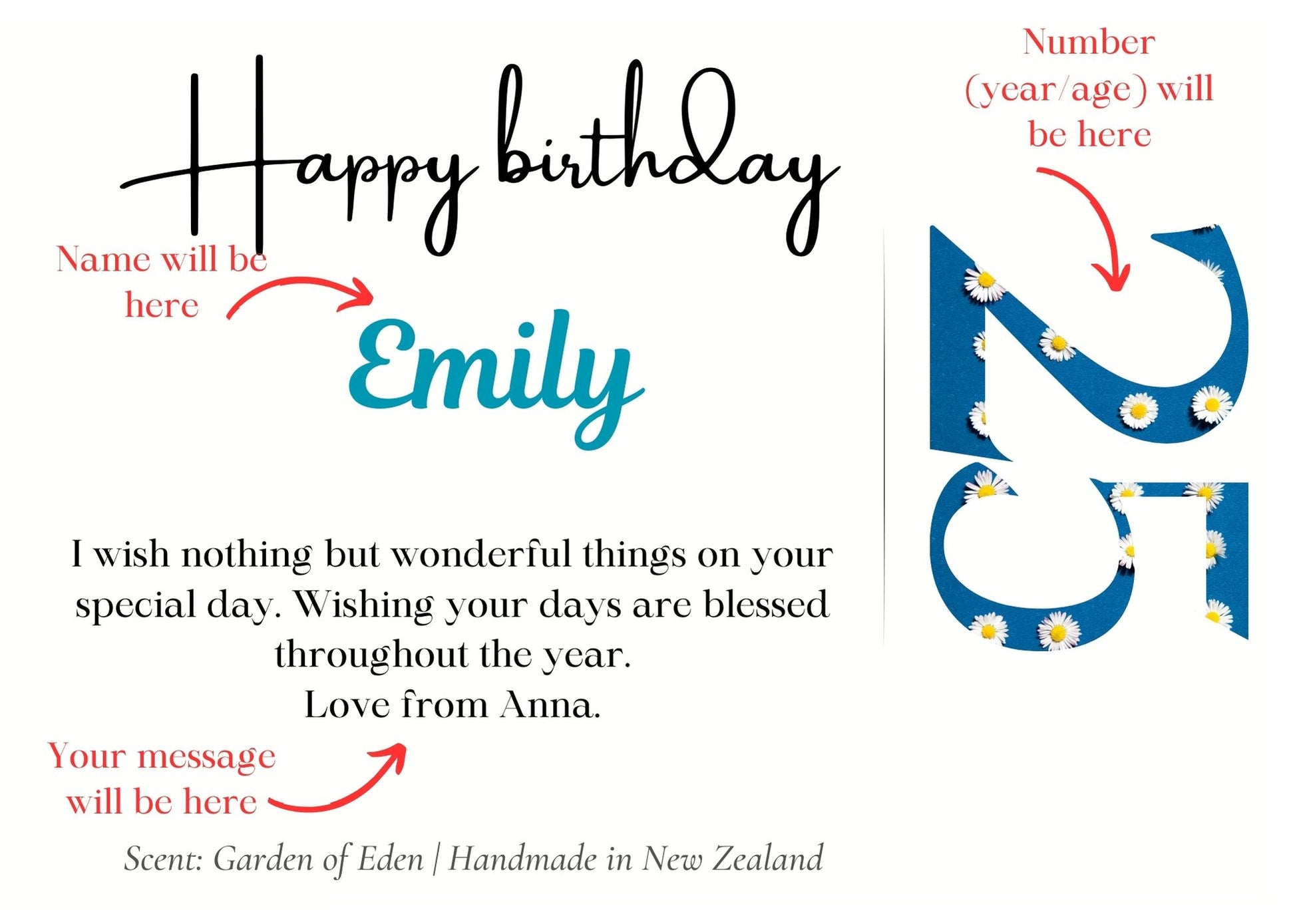This customized candle is a beautiful way to celebrate a special someone's birthday with a beautiful daisy design. Each candle is unique and personalized to commemorate the year of their birth (or their age), their name, and your own message to them, making it a thoughtful and sentimental gift. It is a wonderful way to show your love and care to whoever you give.